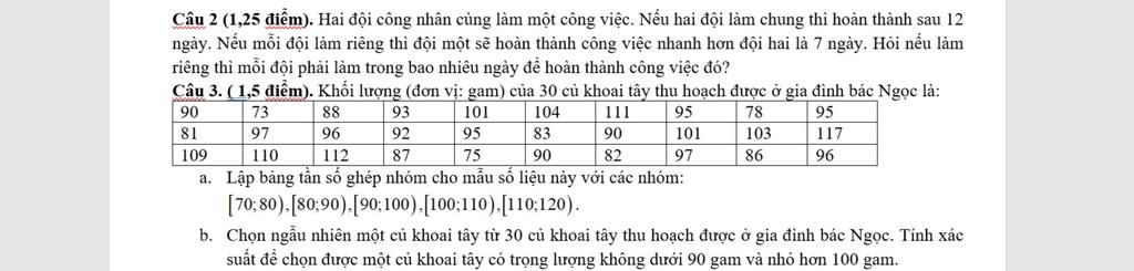 Câu 2 (1,25 điểm). Hai đội công nhân củng làm một công việc. Nếu hai đội làm chung thì hoàn thành sau 12
