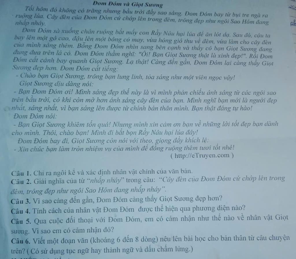 - Dịu dàng, lịch sự: Giọt Sương đáp lời Đom Đóm một cách nhẹ nhàng và thân thiện.