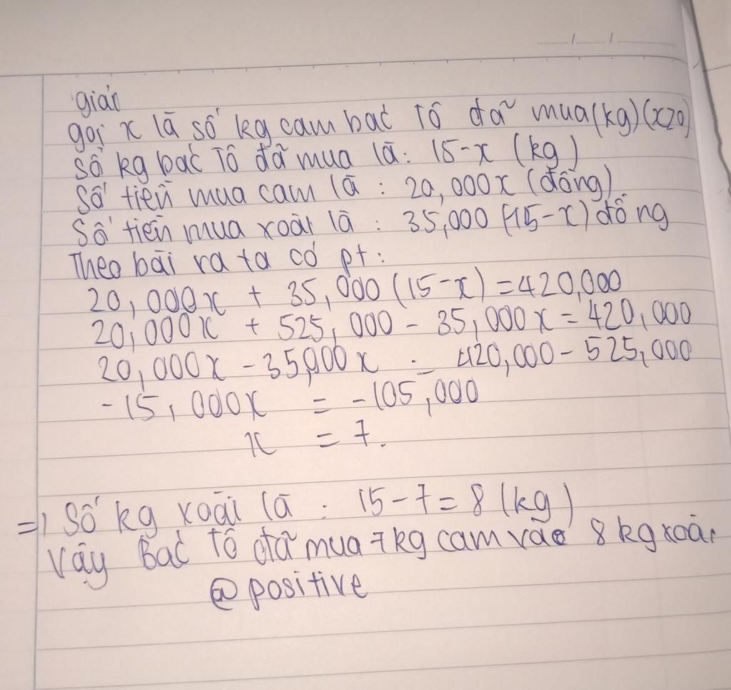 $\to$Bác mua $7$ kg cam và $15-7=8$ kg xoài