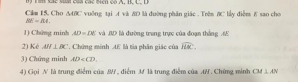 Câu 15. Cho ABC vuông tại A và BD là đường phân giác . Trên BC lấy điểm E sao cho