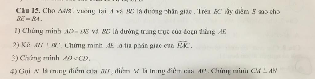 Câu 15. Cho ABC vuông tại A và BD là đường phân giác . Trên BC lấy điểm E sao cho