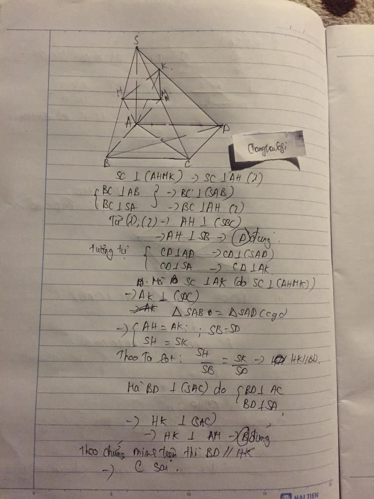 Cho hình chóp S.ABCD có đáy ABCD là hình vuông SA vuông (ABCD) .Mặt phẳng qua A và vuông góc với SC cắt SB ,SC.SD theo thứ tự H,M,K chọn khẳng định sai
