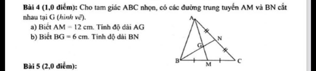 Vì `2` đường trung tuyến `AM` và `BN` là đường trung tuyến cắt nhau tại `G` của `\triangle` `ABC`