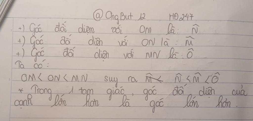 $\text{Xét △ OMN có OM<ON<MN suy ra góc N < góc M }$