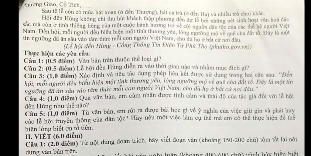 Lễ hội đền Hùng được tổ chức từ ngày 01 đến 10 tháng 3 âm lịch hàng năm, vào ngày chính hội (10/3) diễn ra các hoạt động tế lễ rất trang trọng để tưởng nhớ các vua Hùng, những người có công dựng nước. Đền Hùng tọa lạc trên núi Nghĩa Lĩnh, tỉnh Phú Thọ, là nơi hội tụ của các giá trị văn hóa và tinh thần dân tộc. Trong lễ hội, các hoạt động như lễ dâng hương, rước kiệu, múa hát xoan, hát ca trù và nhiều trò chơi khác được tổ chức, thu hút đông đảo người dân và du khách. Lễ hội không chỉ mang ý nghĩa văn hóa mà còn là dịp để mỗi người thể hiện lòng yêu quê hương, đất tổ, góp phần gìn giữ và phát huy các giá trị văn hóa truyền thống của dân tộc. Qua đây, ta thấy rằng việc tham gia lễ hội là cách để chúng ta bày tỏ lòng biết ơn đối với tổ tiên và gìn giữ bản sắc văn hóa của dân tộc.