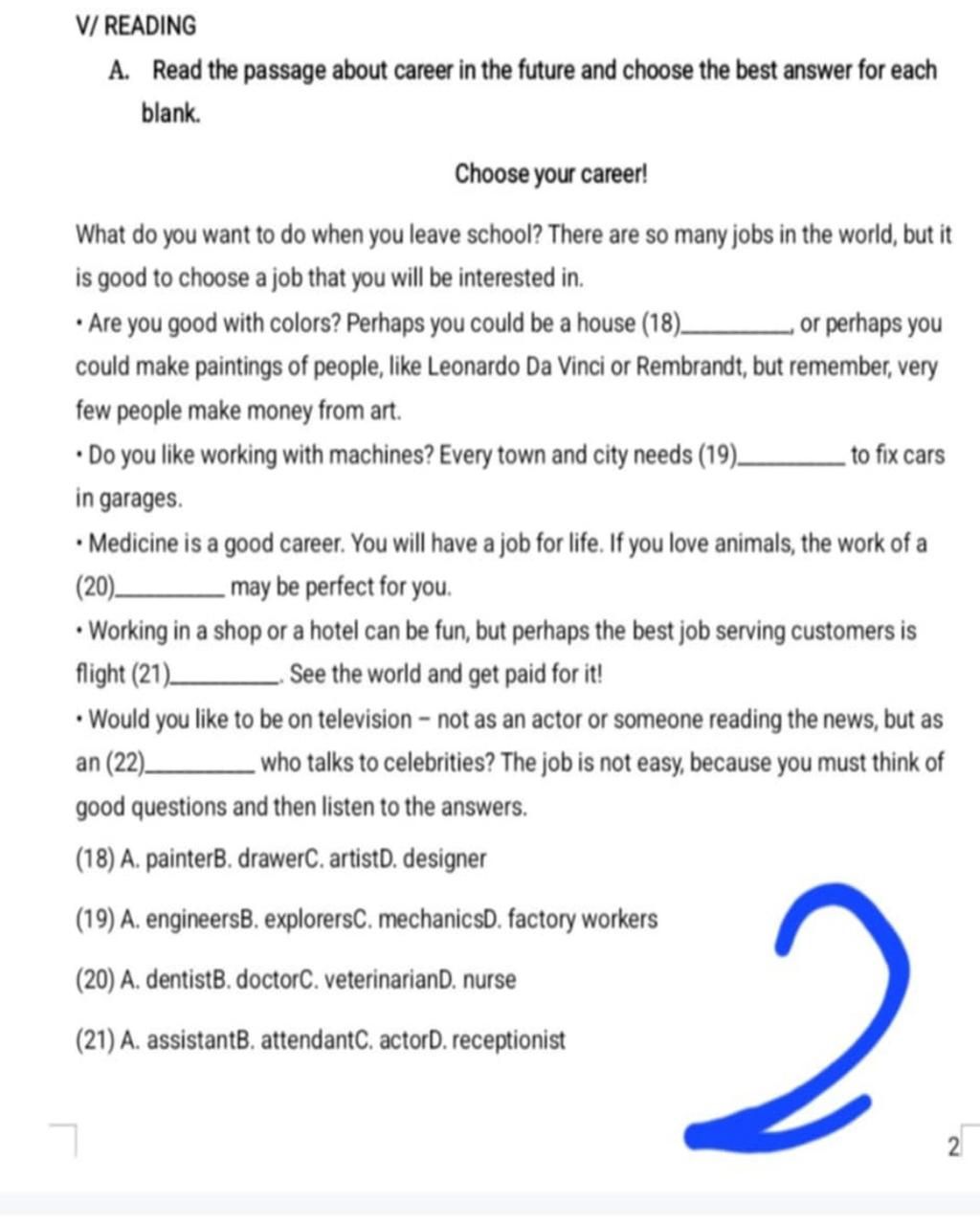 18. A vì có từ khóa " good with color " vì nó liên quan đến nghệ sĩ nên chọn painter- họa sĩ