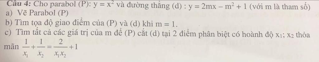 Câu 4: Cho parabol (P): y = xẻ và đường thẳng (d) : y = 2mx - m + 1 (với m là tham số)