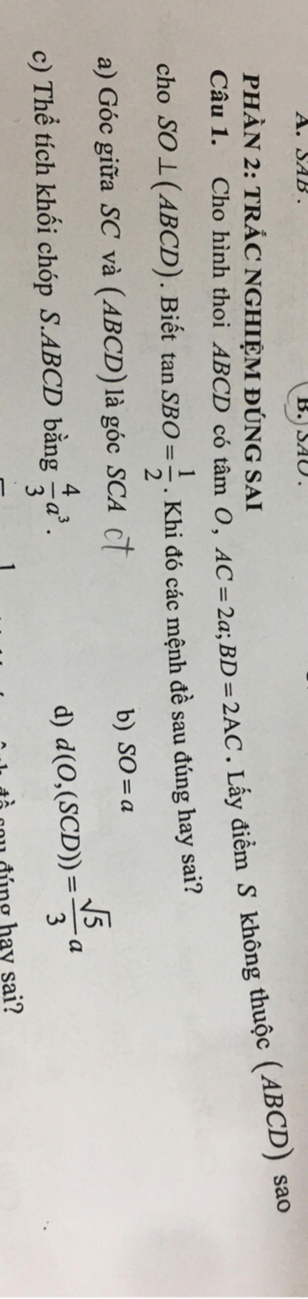 cho SO L(ABCD). Biết tan SBO= Khi đó các mệnh đề sau đúng hay sai?