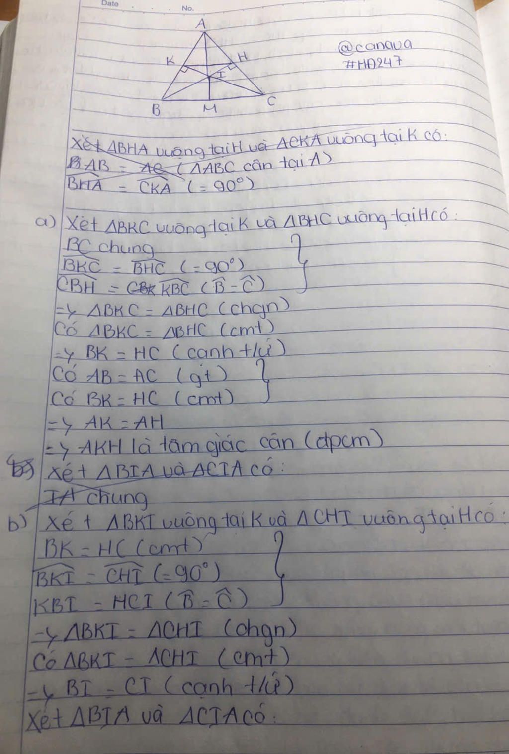 Cho tam giác ABC cân tại A Kẻ BH vuông góc với AC , CK vuông góc với AB ( H thuộc AC , K thuộc AB )