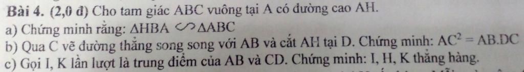 Bài 4. (2,0 đ) Cho tam giác ABC vuông tại A có đường cao AH.