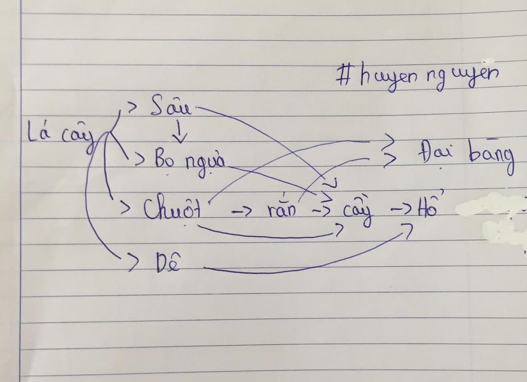 Hãy vẽ sơ đồ một lưới thức ăn trong hệ sinh thái rừng mưa nhiệt đới gồm: đại bàng,hổ,sâu,chột,bọ ngựa,rắn,dê,cầy,lá cây?