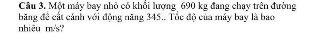 $\Rightarrow v = \sqrt{\dfrac{2W_{đ}}{m}} = \sqrt{\dfrac{2*345\ 000}{690}} = 10\sqrt{10}\ (m/s)$
