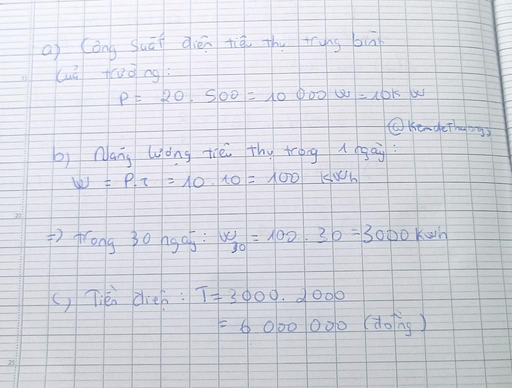 Một trường học có 20 phòng học, tính trung bình mỗi phòng học sử dụng điện trong 10 giờ mỗi ngày với một công suất điện tiêu thụ 500W