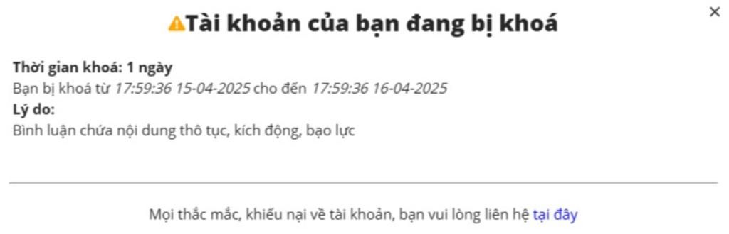 Bạn bị khoá từ 17:59:36 15-04-2025 cho đến 17:59:36 16-04-2025