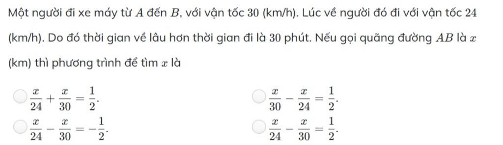Vậy phương trình cần tìm là `x/24 - x/30 = 1/2`.