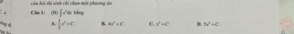 ADCT: `int\ x^n\ dx=(x^(n+1))/(n+1}+C\ `$\\$`=>int\ x^4\ dx=1/5\ x^5+C`$\\$`color{green}{=>\ text{Chọn A}}`