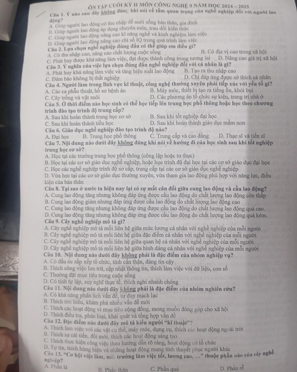 Câu 1. Ý nào sau đây không đúng, khi nói về tầm quan trọng của nghề nghiệp đối với người lao
