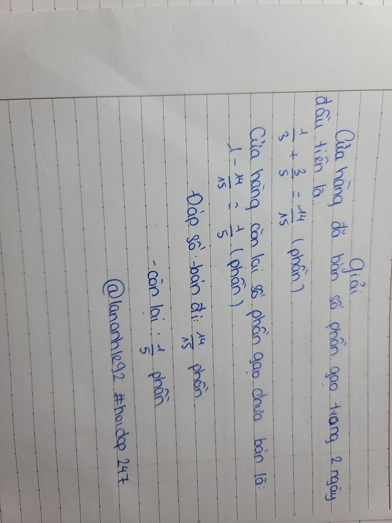 Một của hàng bán gạo ngày đầu bán được 1/3 số gạo. ngày thu hai ban được 3/5 so gạo hỏi. Cua hàng đa ban được bao nhiều phần cua so gạo và cua hoang con lai bao nhiều phàn của gạo
