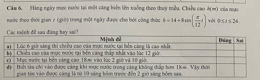 Câu 6. Hàng ngày mực nước tại một cảng biển lên xuống theo thuỷ triều. Chiều cao h(m) của mực