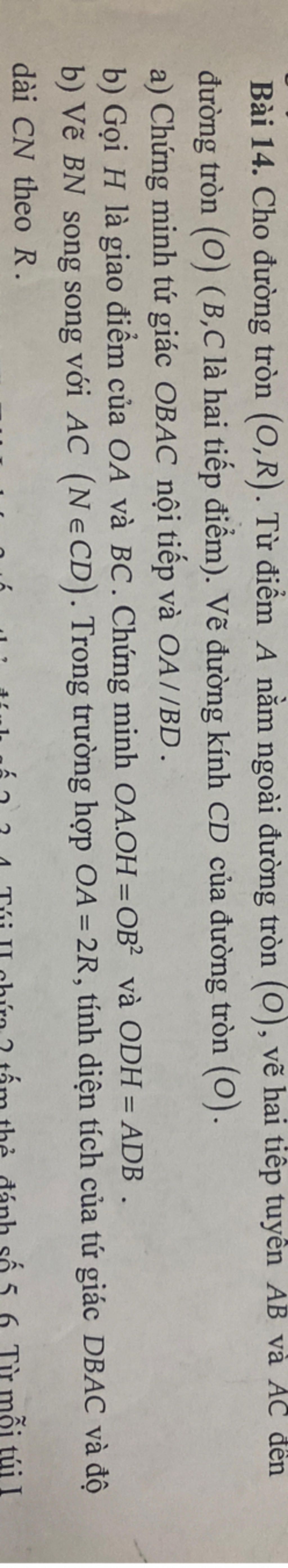 Cho đường tròn (O,R). Từ điểm A nằm ngoài đường tròn (O), vẽ 2 tiếp tuyến AB và AC đến đường tròn (O) (B,C là hai tiếp điểm). Vẽ đường kính CD của đường tròn (O)