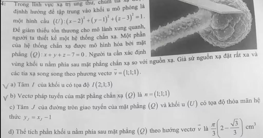Tâm của khối u (U): $(x-2)^2+(y-1)^2+(z-3)^2=1$ là $I(2,1,3), R=1$