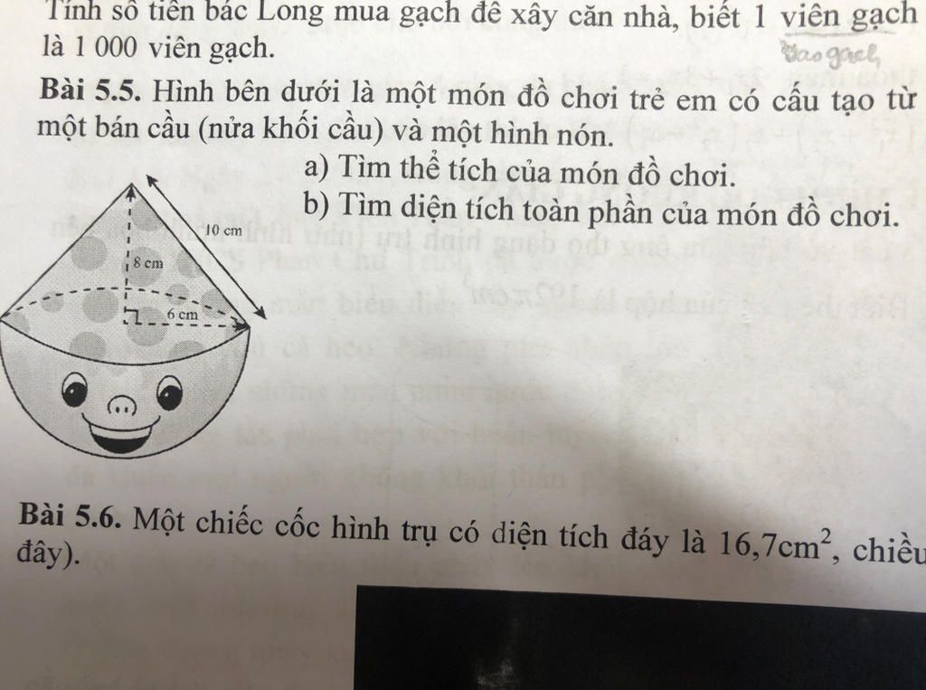 `=>` Thể tích của món đồ chơi: `V= V_1 + V_2 = 96 pi + 144 pi = 240 pi (cm^3)`
