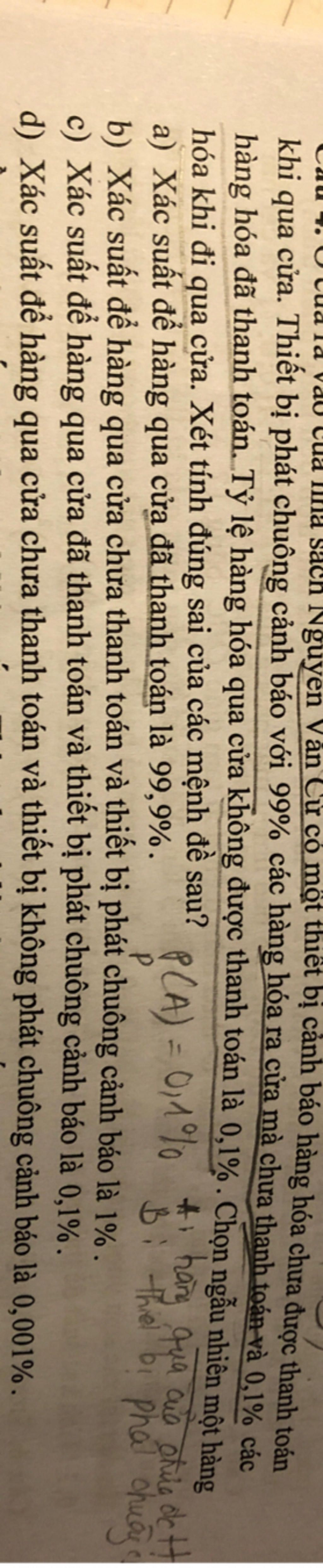 Ở cửa ra vào của nhà sách Nguyễn Văn Cừ có một thiết bị cảnh báo hàng hoá chứ được thanh toán khi qua cửa. Thiết bị phát chuông cảnh báo với 99% các hàng hóa ra cửa mà chưa thanh toán và 0,1% các hàng hóa đã thanh toán. Tỷ lệ hàng hóa qua cửa không được thanh toán là 0,1%. Chọn ngẫu nhiên một hàng hóa khi đi qua cửa. Xét tính đúng sai của các mệnh đề sau?