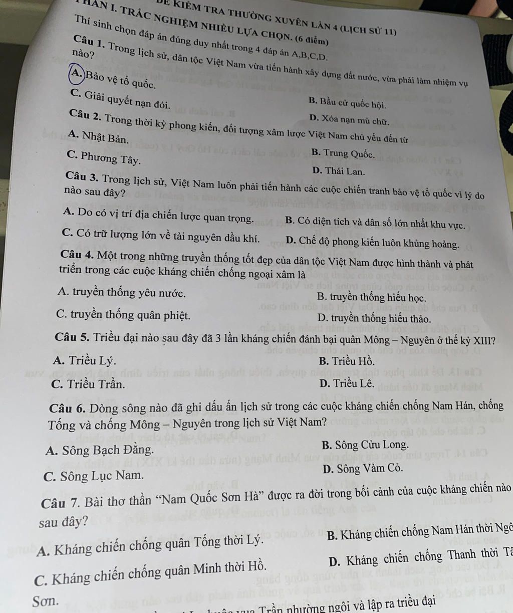 Câu 6: Đáp án đúng là A. Sông Bạch Đằng. Sông Bạch Đằng là nơi đã ghi dấu nhiều chiến thắng chống quân xâm lược như Nam Hán, Tống, và Mông – Nguyên.