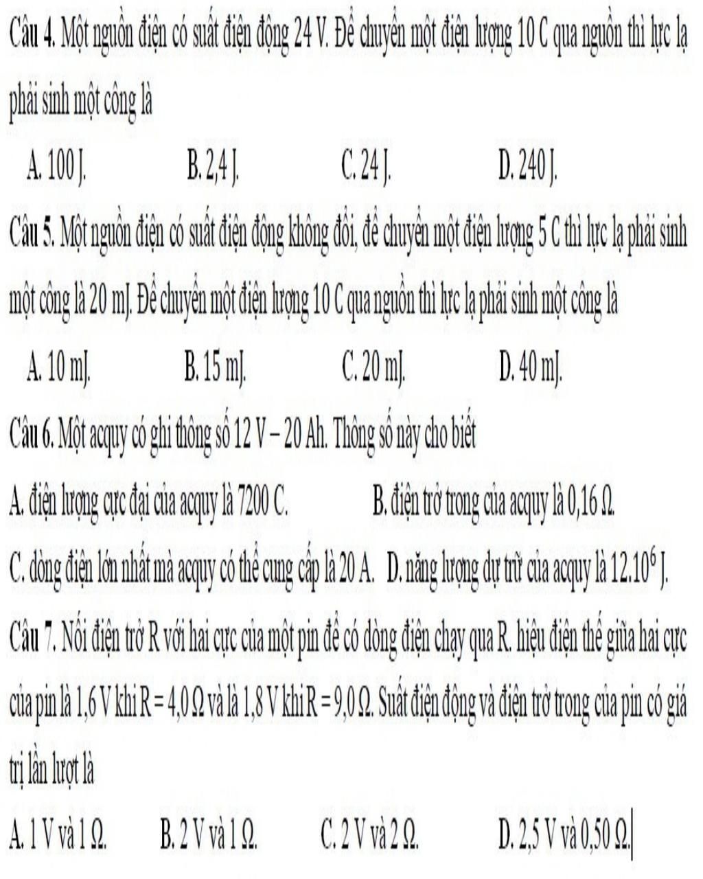 Câu 4. Một nguồn điện có suất điện động 24 V. Để chuyển một điện lượng 10C qua nguồn thì lực l