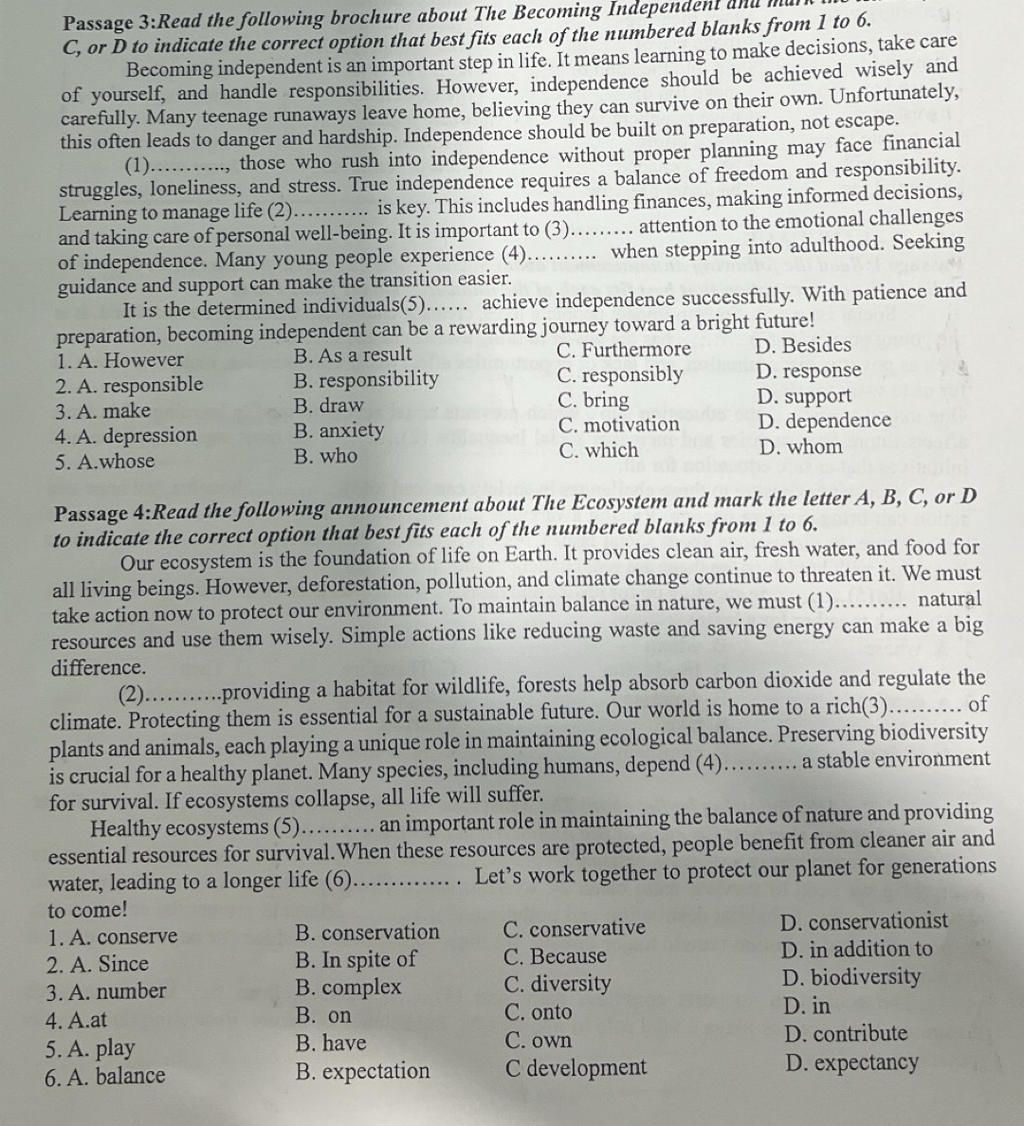 C, or D to indicate the correct option that best fits each of the numbered blanks from 1 to 6.