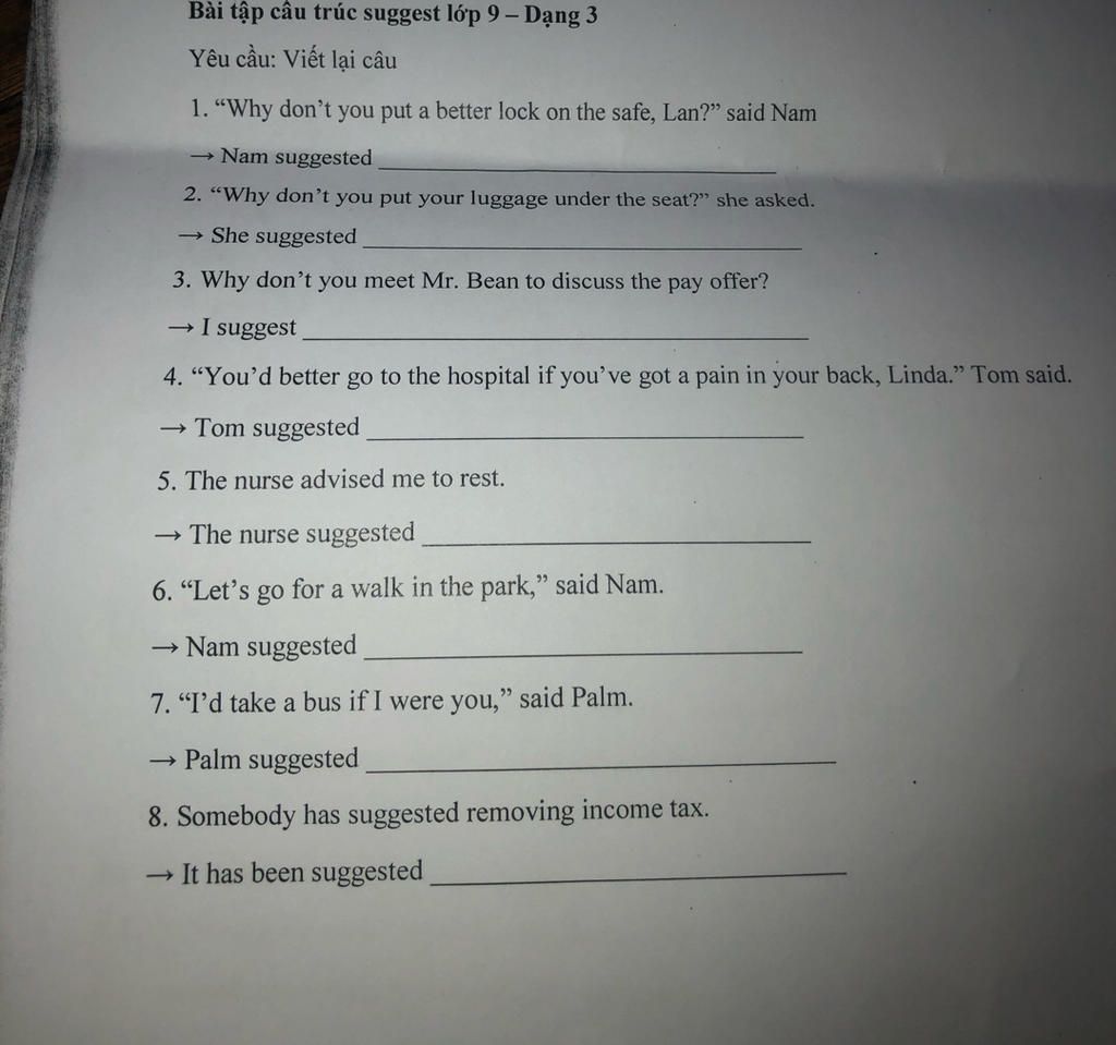 S `+` suggest `+` V`-`ing ` : ` Ai đó gợi ý làm gì