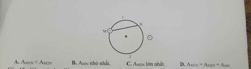 Một vòng tròn tâm O nằm trong điện trường của một điện tích điểm Q. M và N là hai điểm trên vòng tròn đó Gọi `A_(text(MIN))`, `A_(M2N)` và `A_(MN)` là công của lực điện tác dụng lên điện tích điểm q trong các dịch chuyển dọc theo cung MIN và M2N và dây cung MN thì