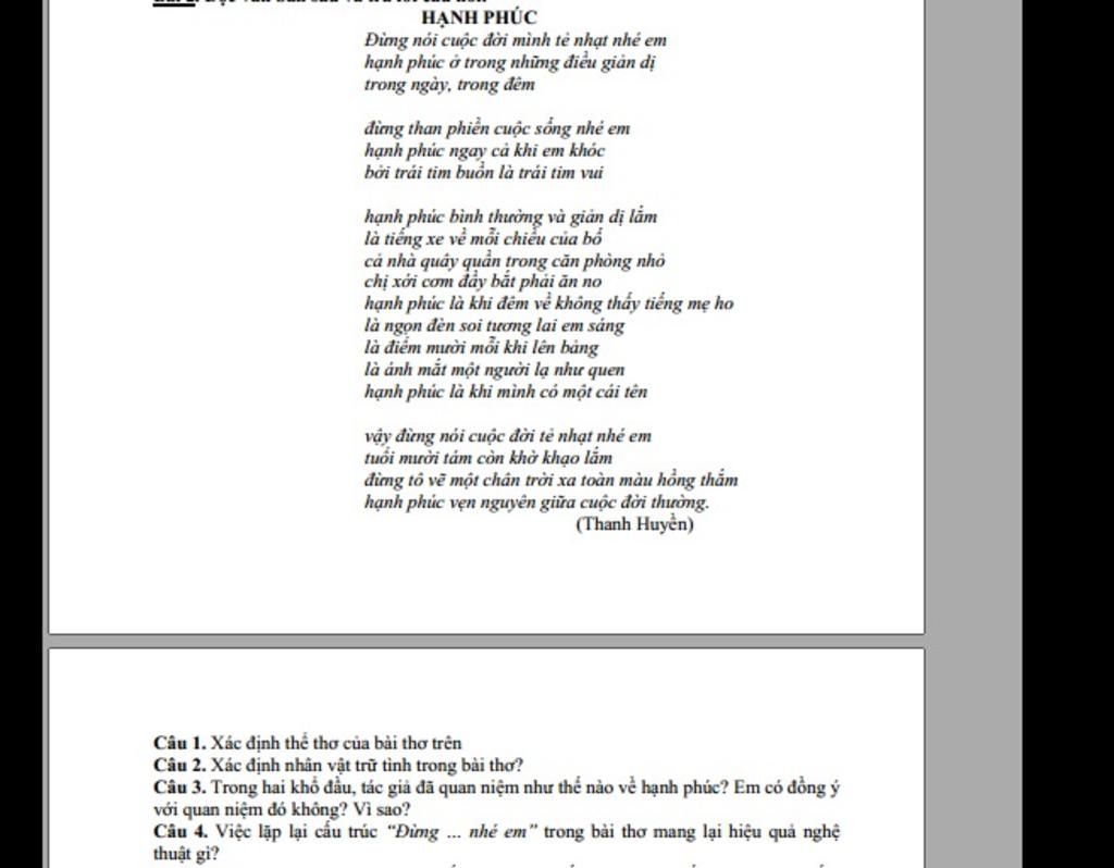 Câu 3. Trong hai khổ đầu, tác giả đã quan niệm như thế nào về hạnh phúc? Em có đồng ý với quan niệm đó không? Vì sao?