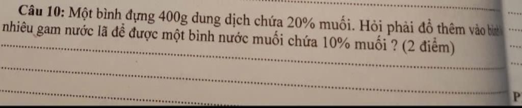 `⇒`Vậy phải đổ thêm vào `400` gam nước lã để được một bình nước muối chứa `10%` muối.