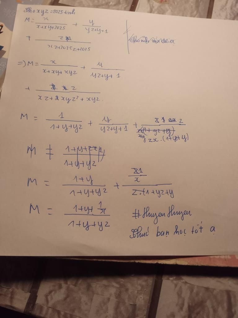 Cho `xyz=2025` Tinh `M =x/(x+xy+2025)+y/(yz+y+1)+z/(xz+2025z+2025)`