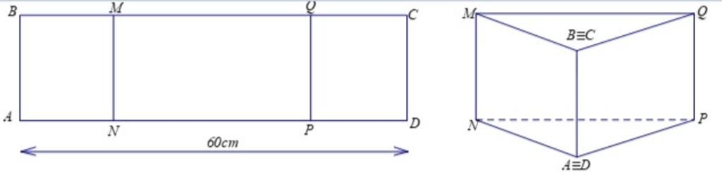 Cho một tấm nhôm hình chữ nhật ABCD có AD = 60 cm. Ta gập tấm nhôm theo hai cạnh MN và PQ vào phía trong đến khi AB và DC trùng nhau, với AN = PD (như hình vẽ dưới đây) để được một hình lăng trụ. Tìm độ dài đoạn AN để thể tích khối lăng trụ lớn nhất.