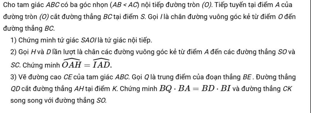 1) Chứng minh tứ giác SAOI là tứ giác nội tiếp.