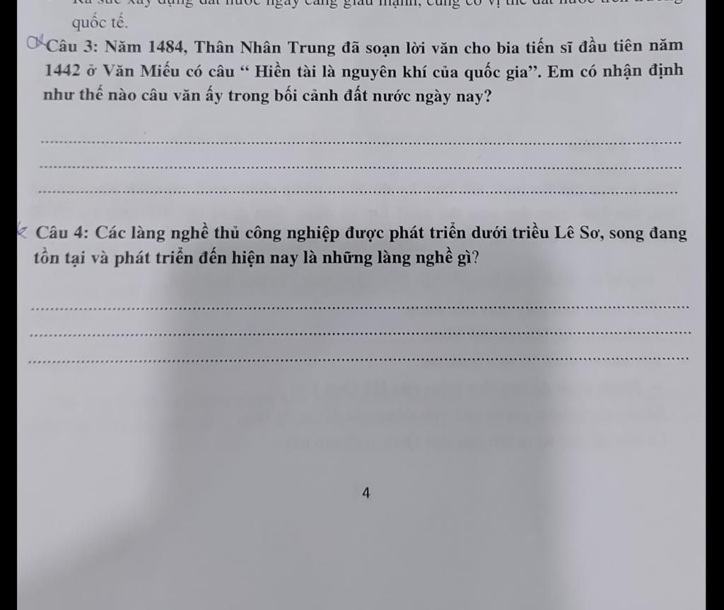 Câu 3: Năm 1484, Thân Nhân Trung đã soạn lời văn cho bia tiến sĩ đầu tiên năm 1442 ở Văn Miếu có câu “Hiền tài là nguyên khí của quốc gia”. Em có nhận định như thế nào về câu văn ấy trong bối cảnh đất nước ngày nay?