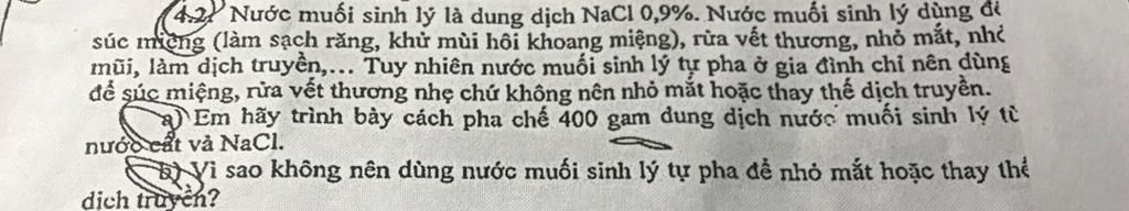 b ) Vì niêm mạc mắt rất mong manh , dễ tổn thương nên nước muối phải đảm bảo độ vô trùng tuyệt đối . Mà nước muối tự pha không đảm bảo được độ vô trùng tuyệt đối nên ta không nên sử dụng nước muối tự pha để nhỏ mắt hoặc thay thế dịch truyền .