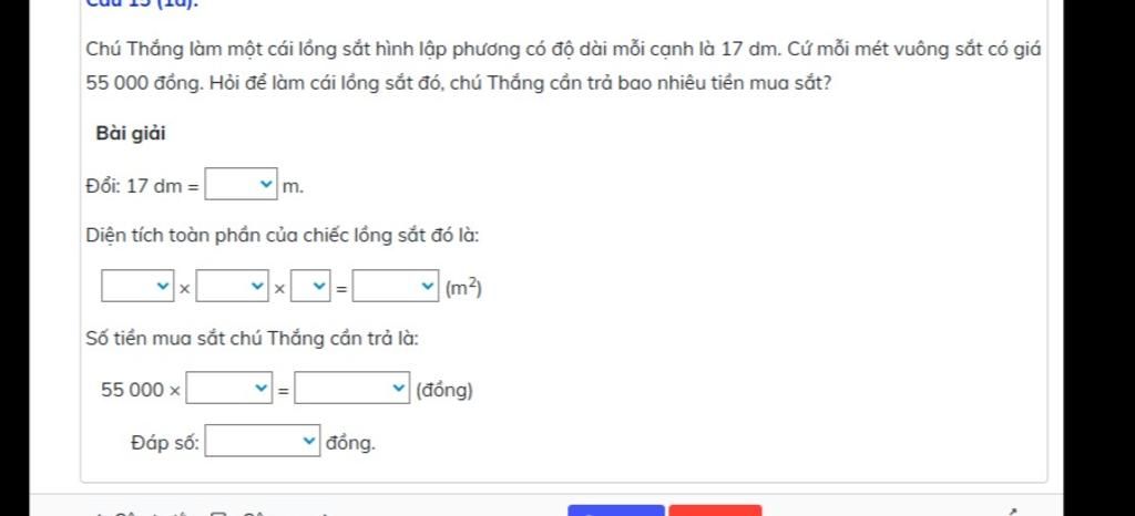 $S_{toàn phần}$ = 6 × $1,7^{2}$ = 17,34 ($m^{2}$)