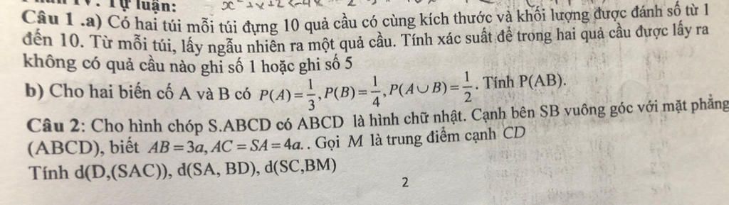 Câu 1 .a) Cổ hai túi mỗi túi đựng 10 quả cầu có cùng kích thước và khối lượng được đánh số từ 1