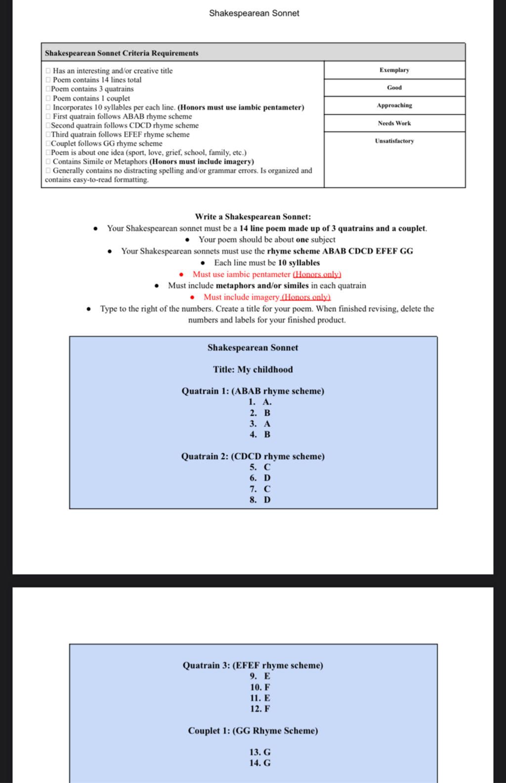 Shakespearean Sonnet Criteria Requirements