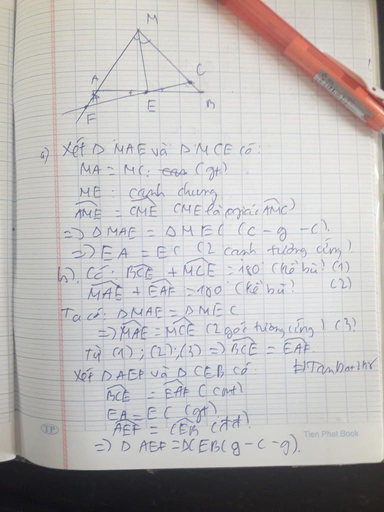 Cho tam giác MAB nhọn MA < MB. Trên cạnh MB lấy điểm C sao cho MA = MC. Tia phân giác của góc AMB cắt cạnh AB tại E gọi F là giao điểm của MA và CE