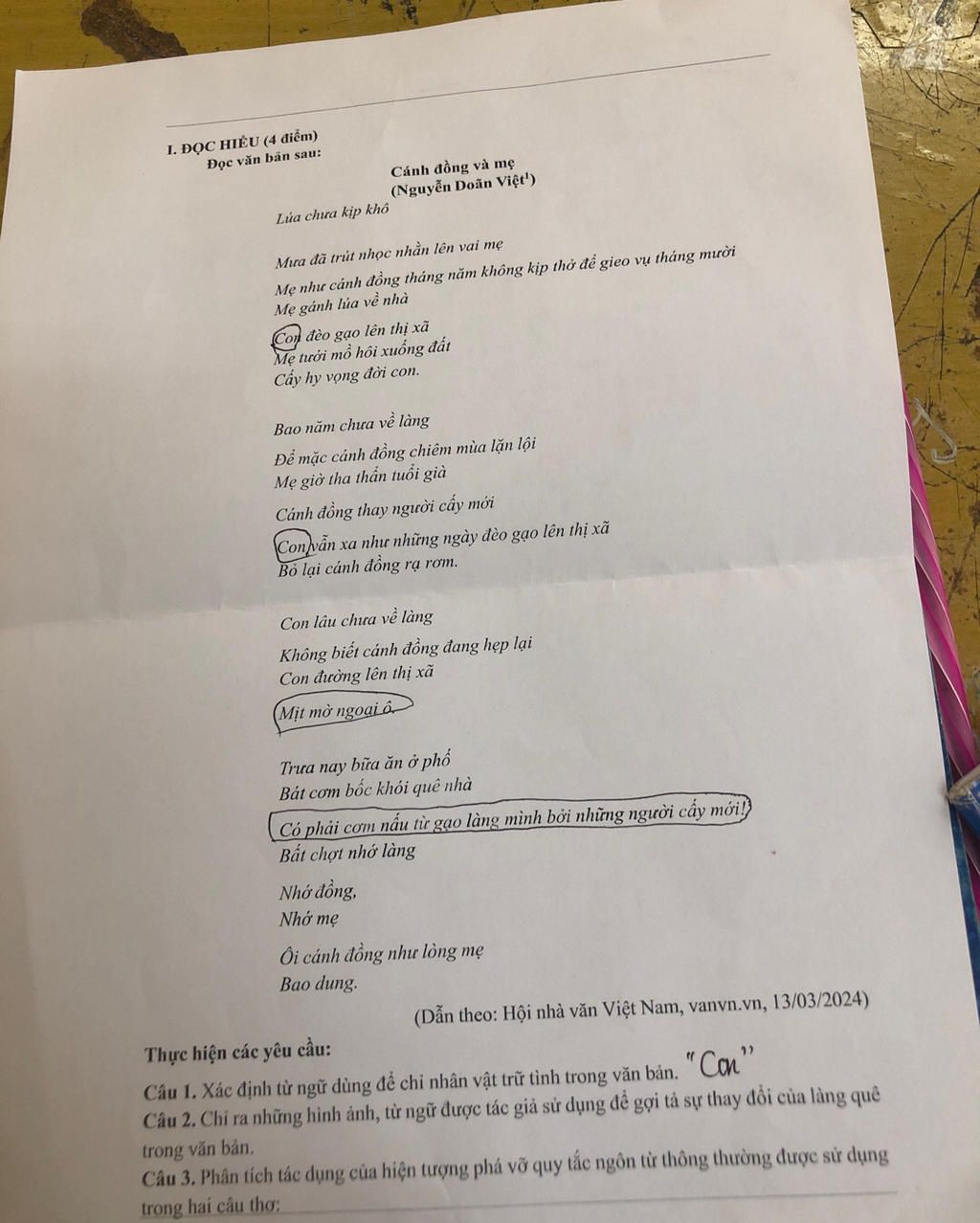 Câu 1. Xác định từ ngữ dùng để chỉ nhân vật trữ tình trong văn bản.