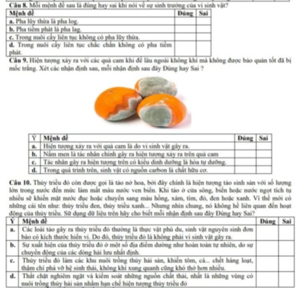 Câu 8. Mỗi mệnh đề sau là đúng hay sai khi nói về sự sinh trưởng của vi sinh vật?