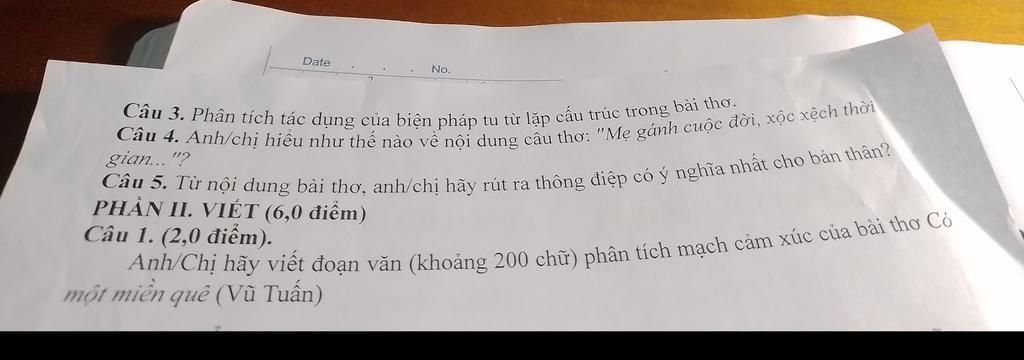 từ nội dung bài thơ anh chị hãy rút ra thông điệp có ý nghĩa nhất cho bản thân phần 2 viết câu 1 Anh chị hãy viết đoạn văn khoảng 200 chữ Phân tích mạch cảm xúc của bài thơ của một miền quê Vũ Tuấn