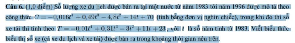 vậy biểu thức biểu thị số xe được bán ra trong khoảng từ năm `1983` tới `1996` là `:``A(x) = -0,026t^4 + 0,8t^3 - 7,8t^2 + 25t + 93`