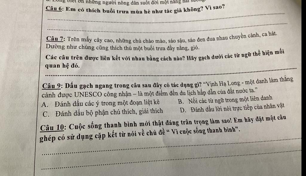 Câu 6: Em thích buổi trưa mùa hè. Vì đó là thời gian vui chơi không người quản.