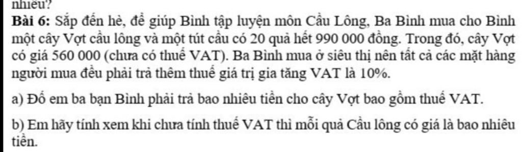 Số tiền ba Bình phải trả cho cây vợt bao gồm thuế `VAT` là: