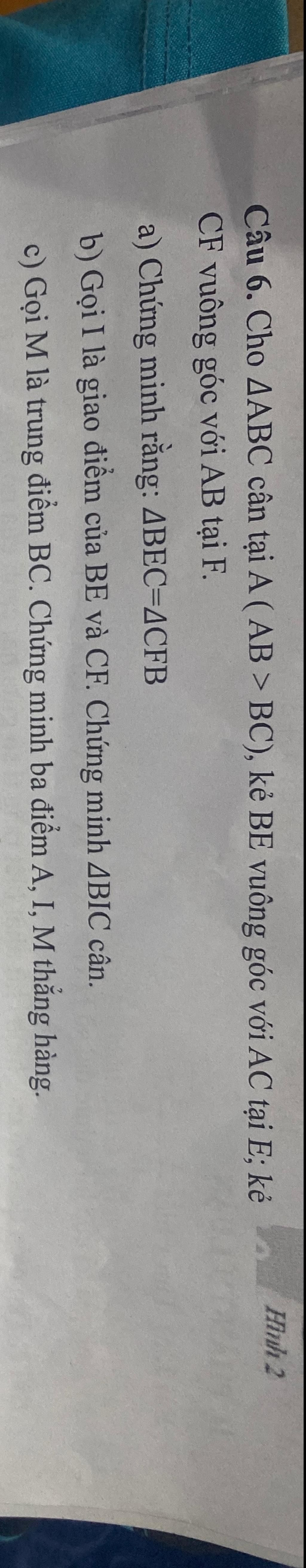 Câu 6. Cho AABC cân tại A (AB > BC), kẻ BE vuông góc với AC tại E; kẻ